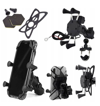 - Uchwyt typu X z 4 ramionami zakończonymi gumowymi chwytakami, ładowarką USB, włącznikiem i kablem